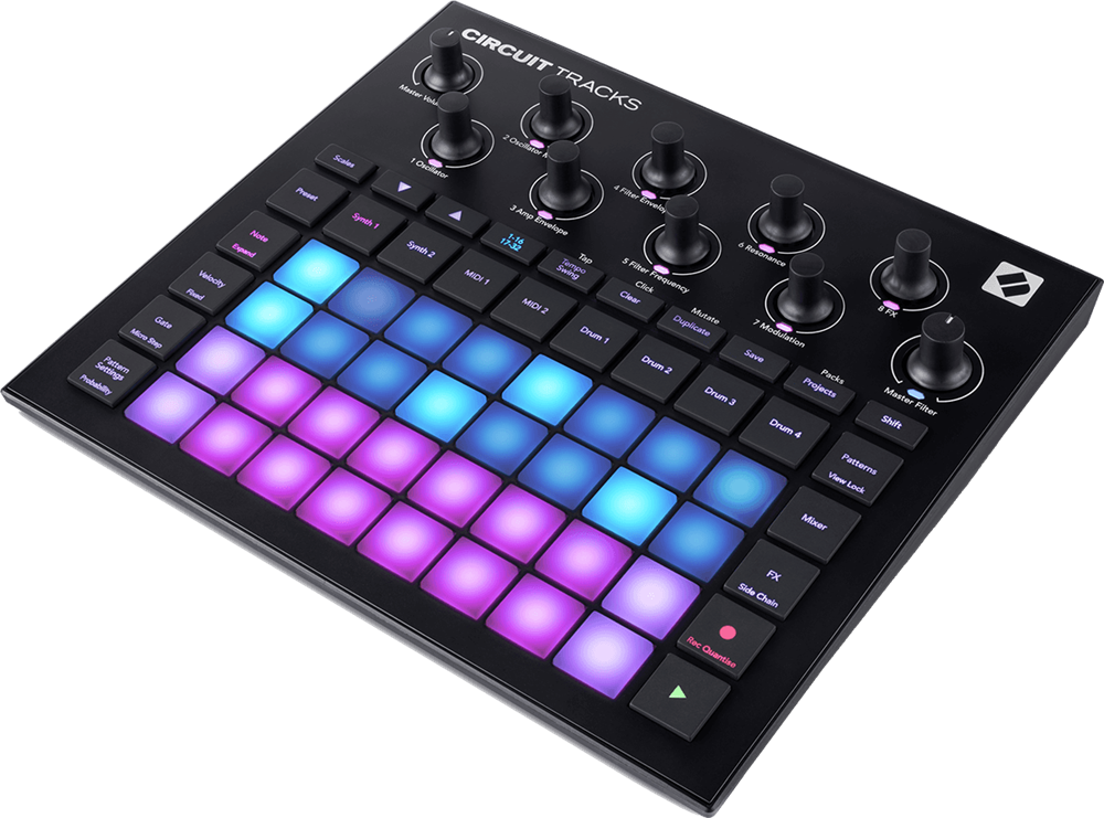 Novation Circuit Tracks er designet til den moderne producer og live-performer, som ønsker fuld kreativ frihed uden at være bundet til en computer. Med to polyfone synth-motorer, fire sample-baserede drum-spor, to MIDI-spor og indbygget microSD-kortslot har du alle værktøjer til at optage, sequencere og performe dine idéer – både hjemme, på scenen eller på farten.