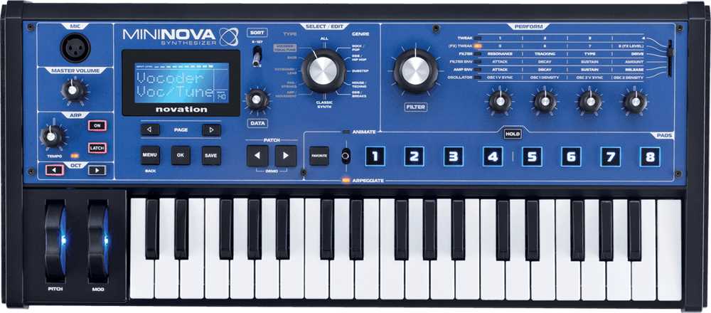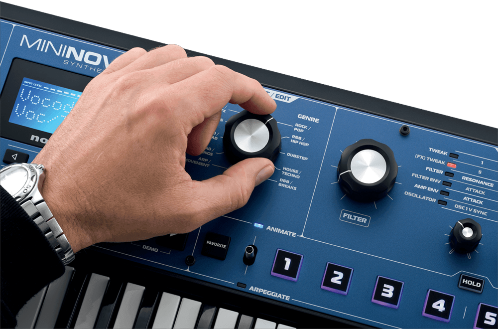 Vocoder-funktionen med tilhørende mikrofon gør MiniNova særligt velegnet til moderne elektroniske produktioner, vokale effekter og live-optrædener. Arpeggiatoren og Animate-knapperne giver ekstra dynamik og gør performancemulighederne både brede og kreative.